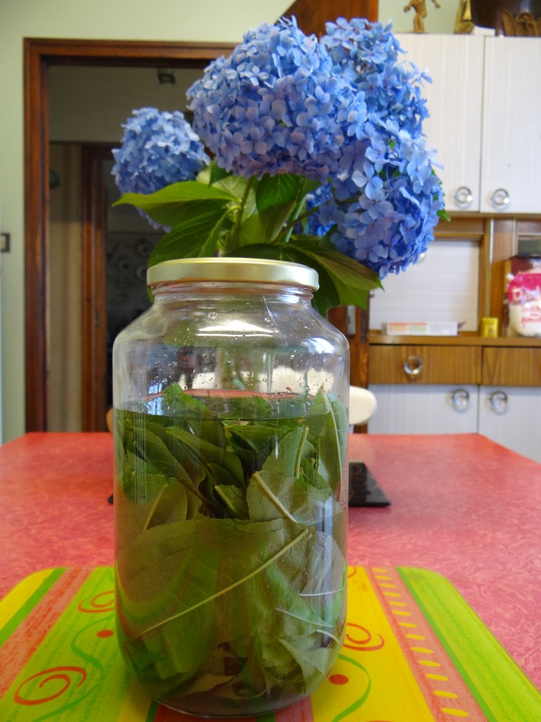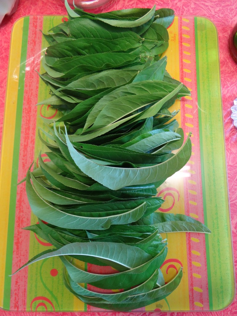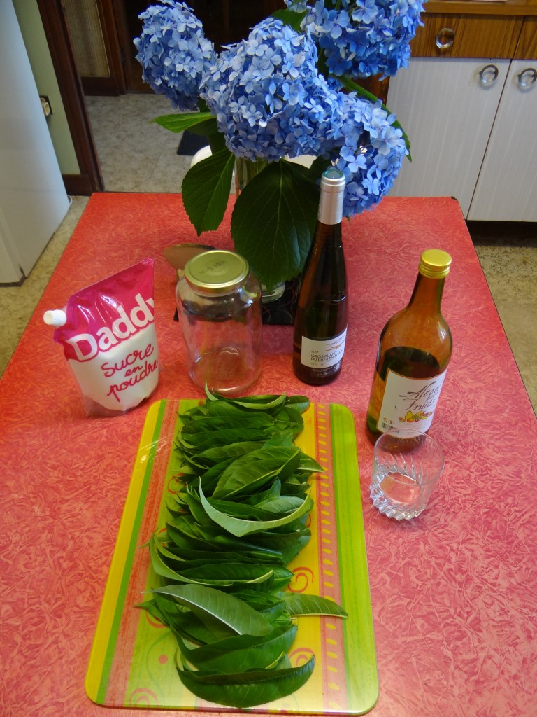 - Verser le vin blanc, un verre de sucre et un verre d’alcool pour fruits à 40° dans le bocal. Y mettre délicatement toutes les feuilles de pêcher. Fermer hermétiquement. Pendant les 3 semaines suivantes (temps minimum), remuer régulièrement le vin et les feuilles. Au bout de ces 3 semaines (qui peuvent aller jusqu’à 2 mois), filtrer le vin de pêche en le versant dans une ou des jolies bouteilles. Bonne dégustation ! / Pour the white wine, a glass of sugar and a 40° glass of fruit alcohol into the jar. Carefully place all the peach leaves. Close tightly. For the next 3 weeks (minimum time), stir the wine and leaves regularly. At the end of these 3 weeks (which can go up to 2 months), filter the peach wine and pour it into one or two nice bottles. Have a good tasting!