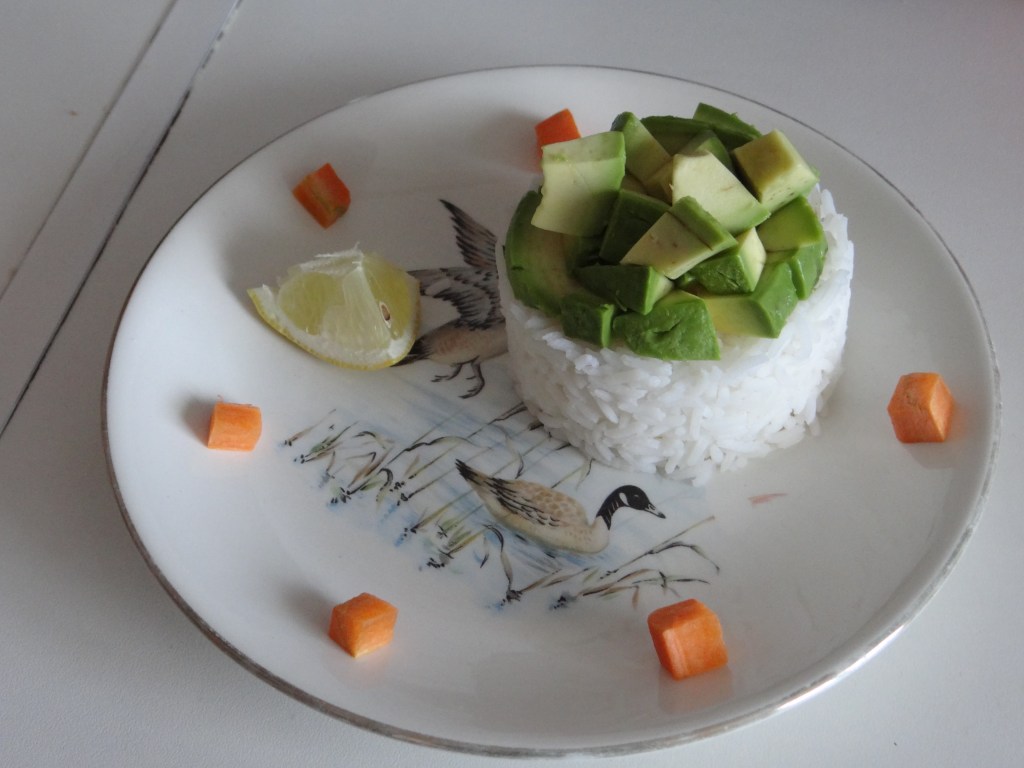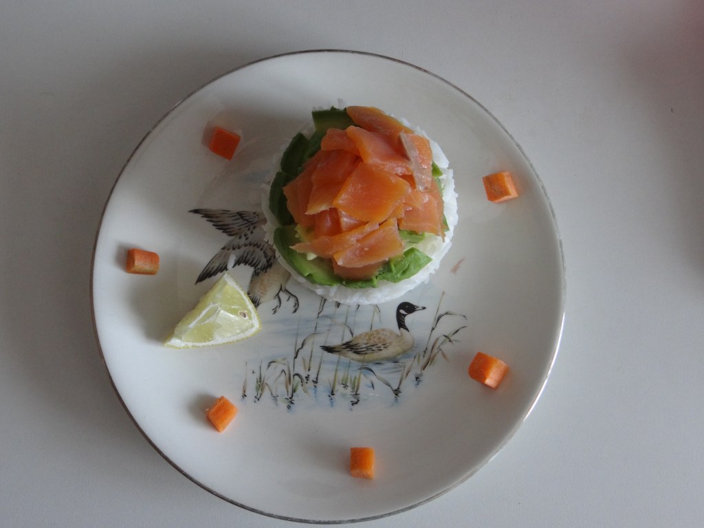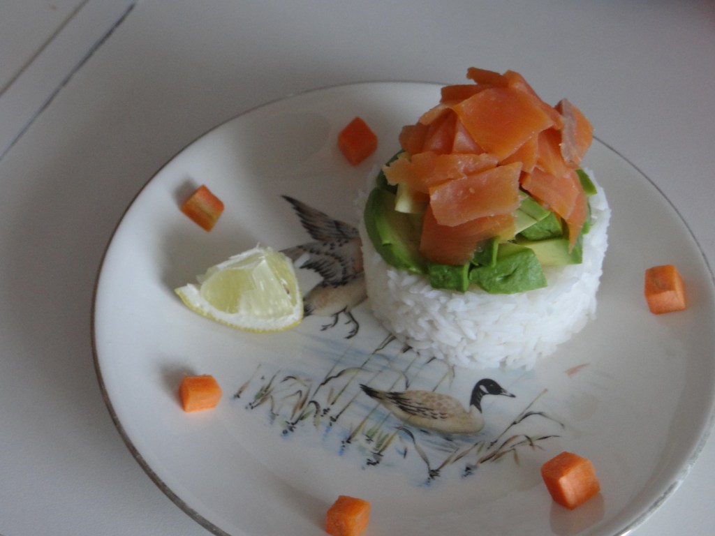 - Pour le dressage, tasser le riz dans un cercle puis ôter le cercle en le levant. Déposer les morceaux d’avocat, puis la truite fumée. Décorer l’assiette avec le citron et les dés de carotte. Accompagner de sauce soja salée et sucrée sur la table. Vous pouvez ajouter des graines de sésame également, je n’en avais pas / For the presentation, press the rice into a circle and remove the circle by lifting it. Place the avocado pieces on the rice, then the smoked trout. Decorate the plate with the lemon and carrot dices. Serve with salted and sweet soy sauce on the table. You can add sesame seeds too, I didn’t have any