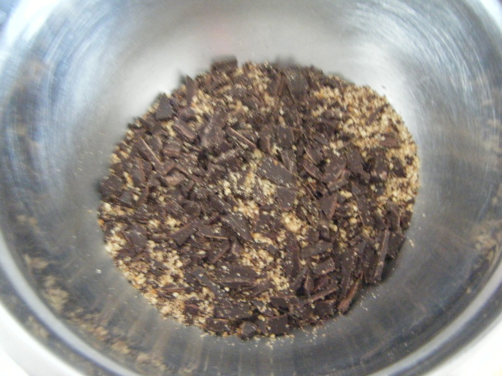 - Couper en petits morceaux le chocolat noir, verser dans un récipient et ajouter la poudre de noisette. Mélanger puis ajouter le beurre mou. Je me sers du pilon en bois d’un mortier pour bien écraser le tout (sans le pulvériser non plus). Si vous avez un mixeur solide, vous pouvez le faire au mixeur / Cut the dark chocolate into small pieces, pour into a container and add the hazelnut powder. Mix and add the soft butter. I use the wooden pestle of a mortar to crush it well (without destroying it either). If you have a solid mixer, you can do it at the mixer.