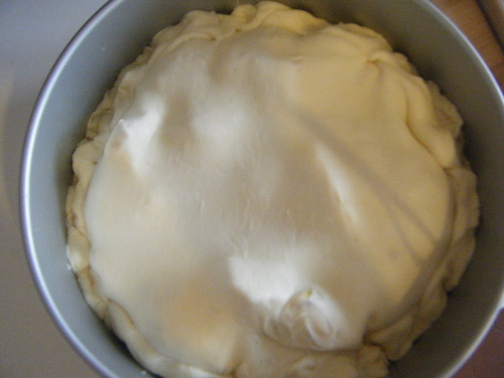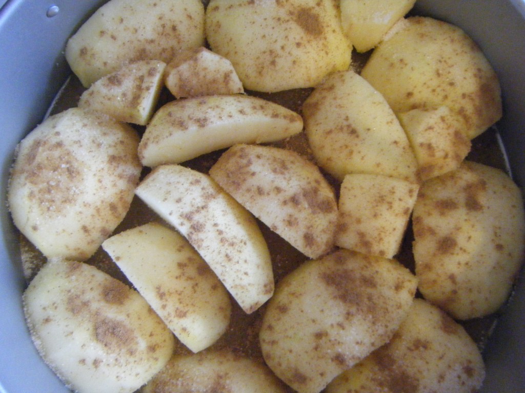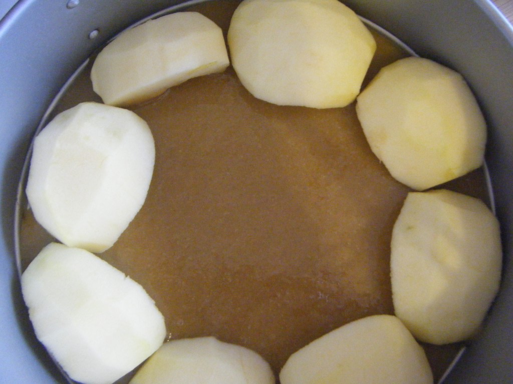 - Spread the apples in the bottom of the mould, sprinkle the apples with vanilla sugar, cinnamon powder and then place the puff pastry on top, pressing the edges all around towards the inside of the mould