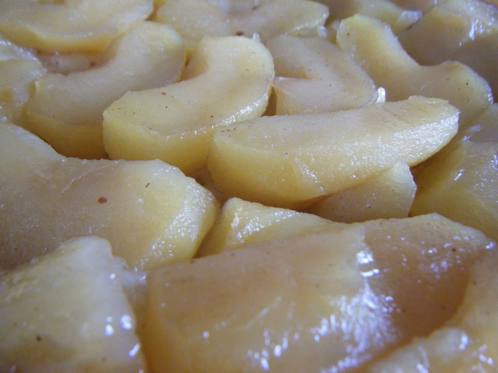 - Répartissez les pommes dans le fonds du moule, saupoudrez les pommes de sucre vanillé, de cannelle en poudre puis déposez la pâte feuilletée dessus en enfonçant bien les bords tout autour vers l’intérieur du moule