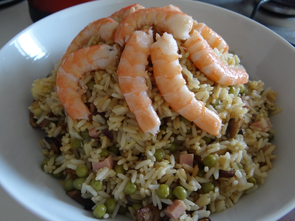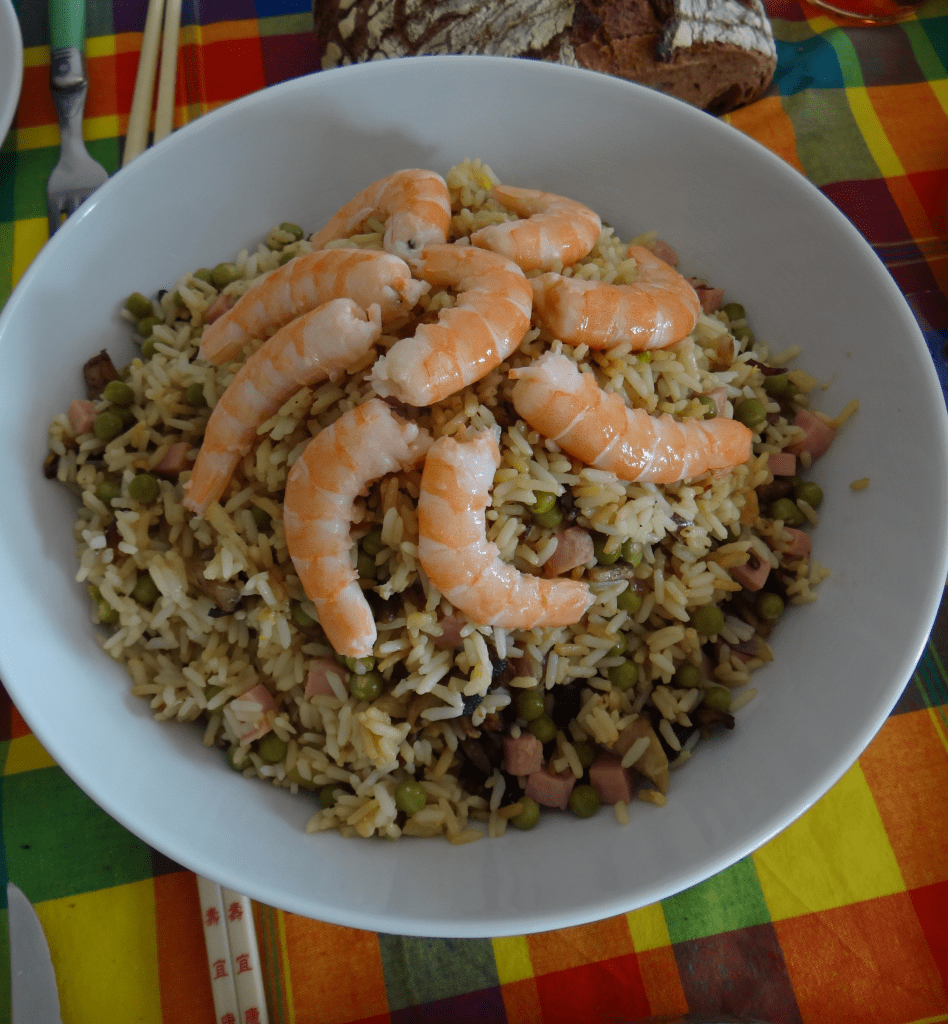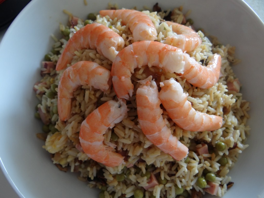 - Disposez dans un joli récipient puis déposez les crevettes sur le riz cantonnais. Dégustez sans attendre