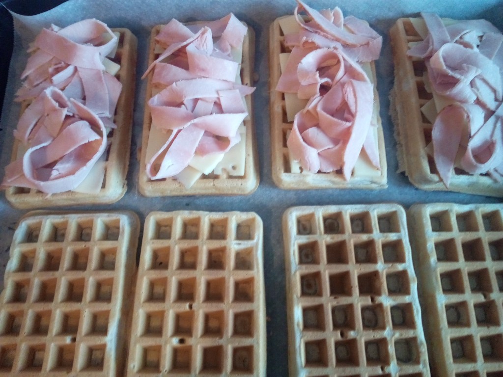 - For the filling, you can make a savoury waffle with strips of ham and gouda cheese, and another waffle with strips of smoked trout and avocado sprinkled with lemon juice