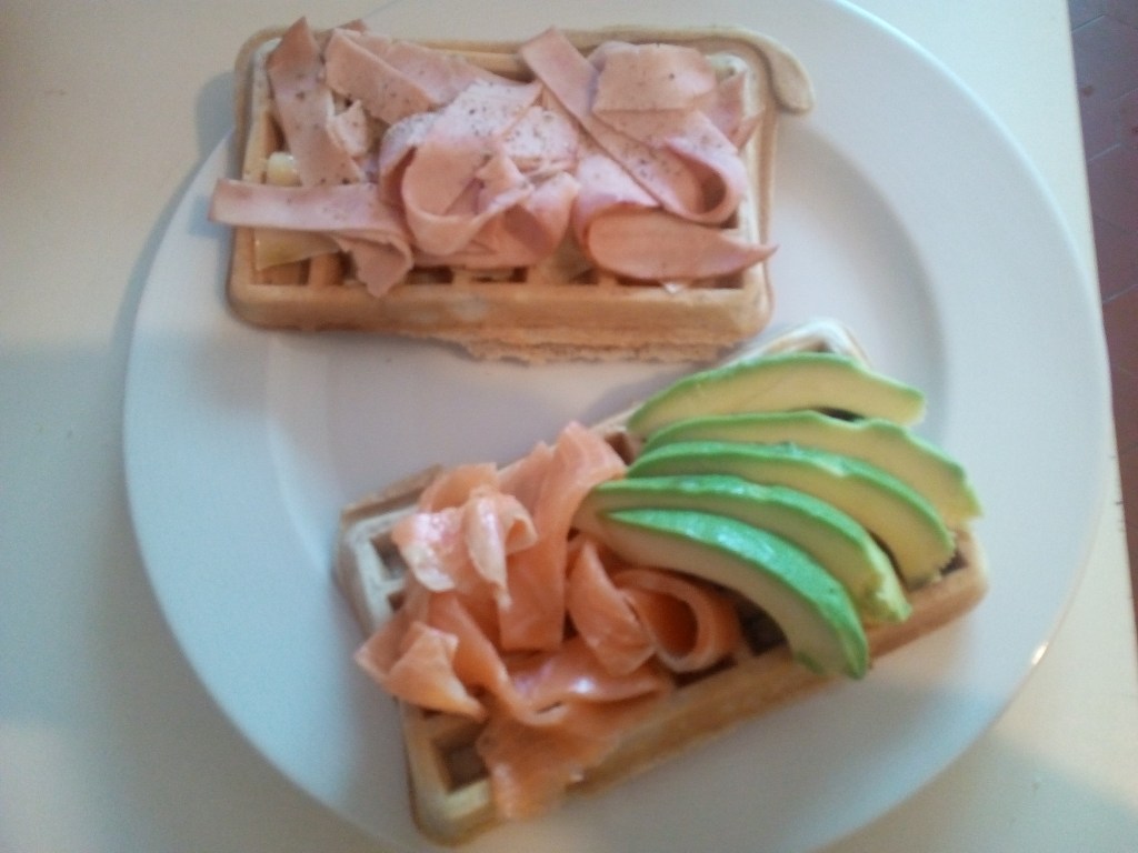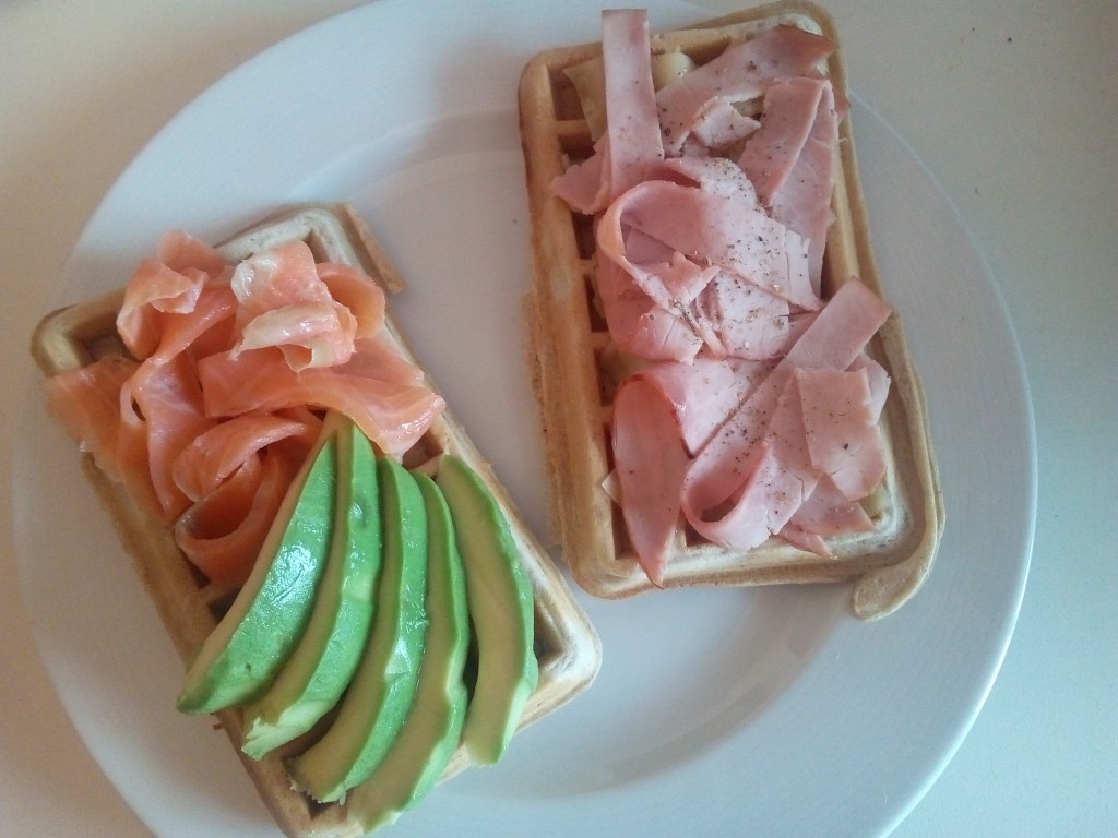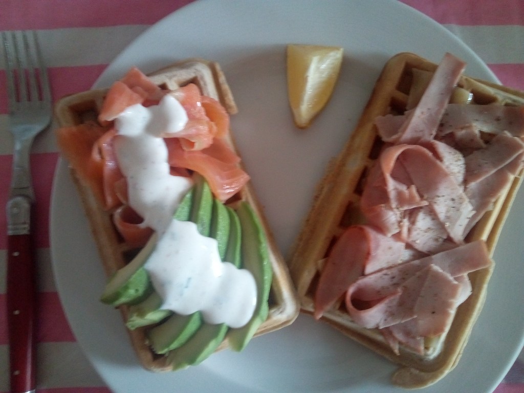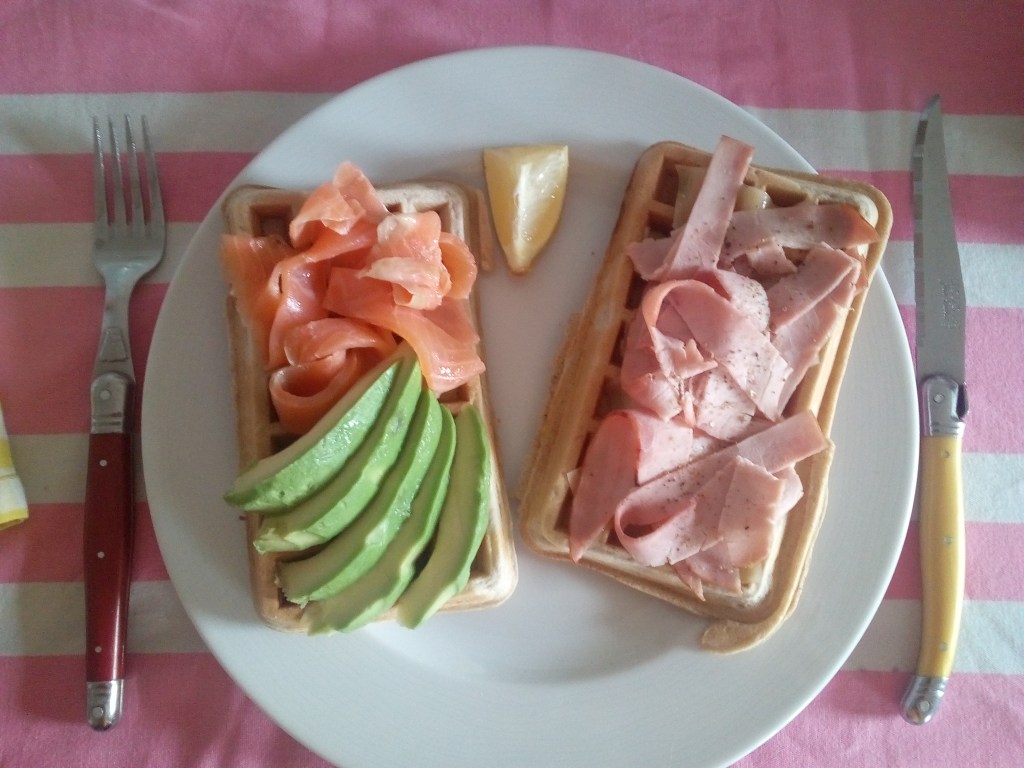 - Pour la garniture, vous pouvez faire une gaufré salée avec des lanières de jambon et de gouda, et une autre gaufre avec des lanières de truite fumée et d’avocat parsemé de jus de citron