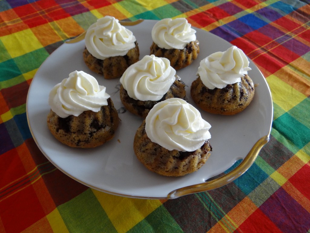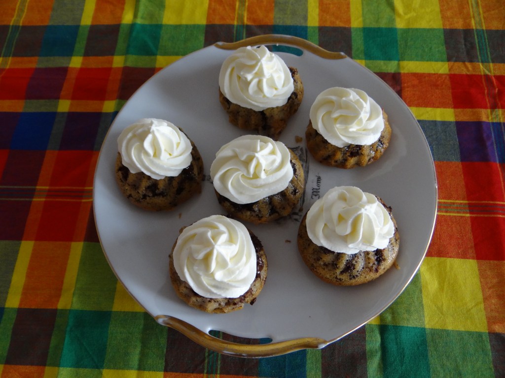 - Lorsque vous démoulez les tigrés, laissez-les tiédir puis préparez la Chantilly. Fouettez les 20 cl de crème à 30% de MG (très froide !) et à la fin rajouter 25 gr de sucre glace. Versez-la dans une poche à douille et montez-la sur les tigrés.
