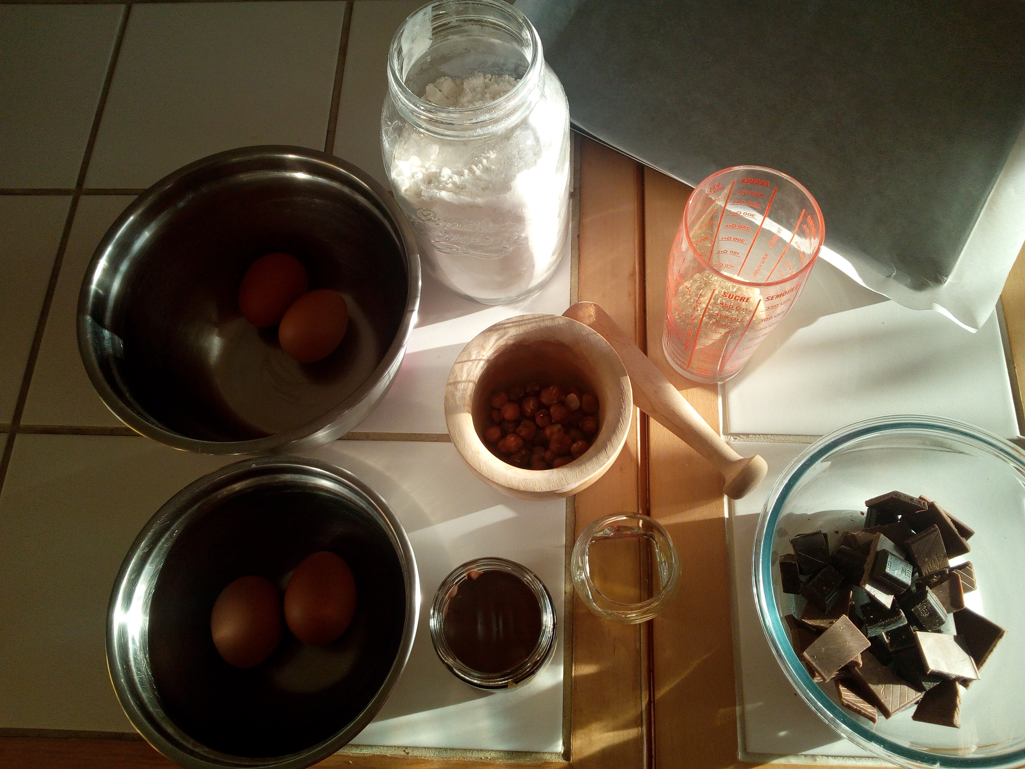 Preheat oven to 410 degrees Fahrenheit. In a saucepan, melt the dark and milk chocolate broken into pieces in a bain-marie. In another saucepan, soften the jar of chocolate hazelnut spread in a bain-marie.