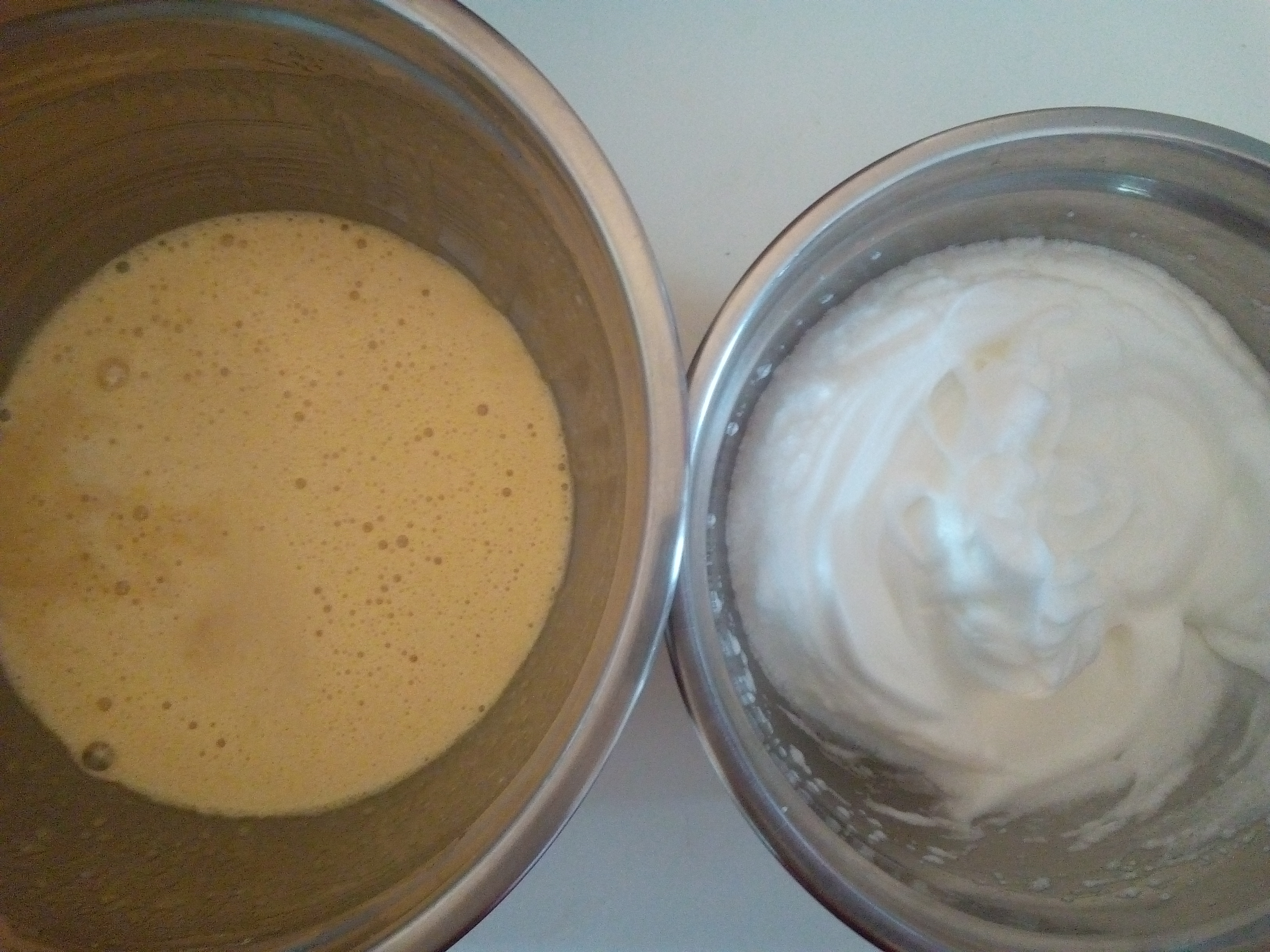 In another bowl, beat the remaining 2 egg whites until stiff. Gently fold the egg whites into the previous mixture (eggs and sugar).