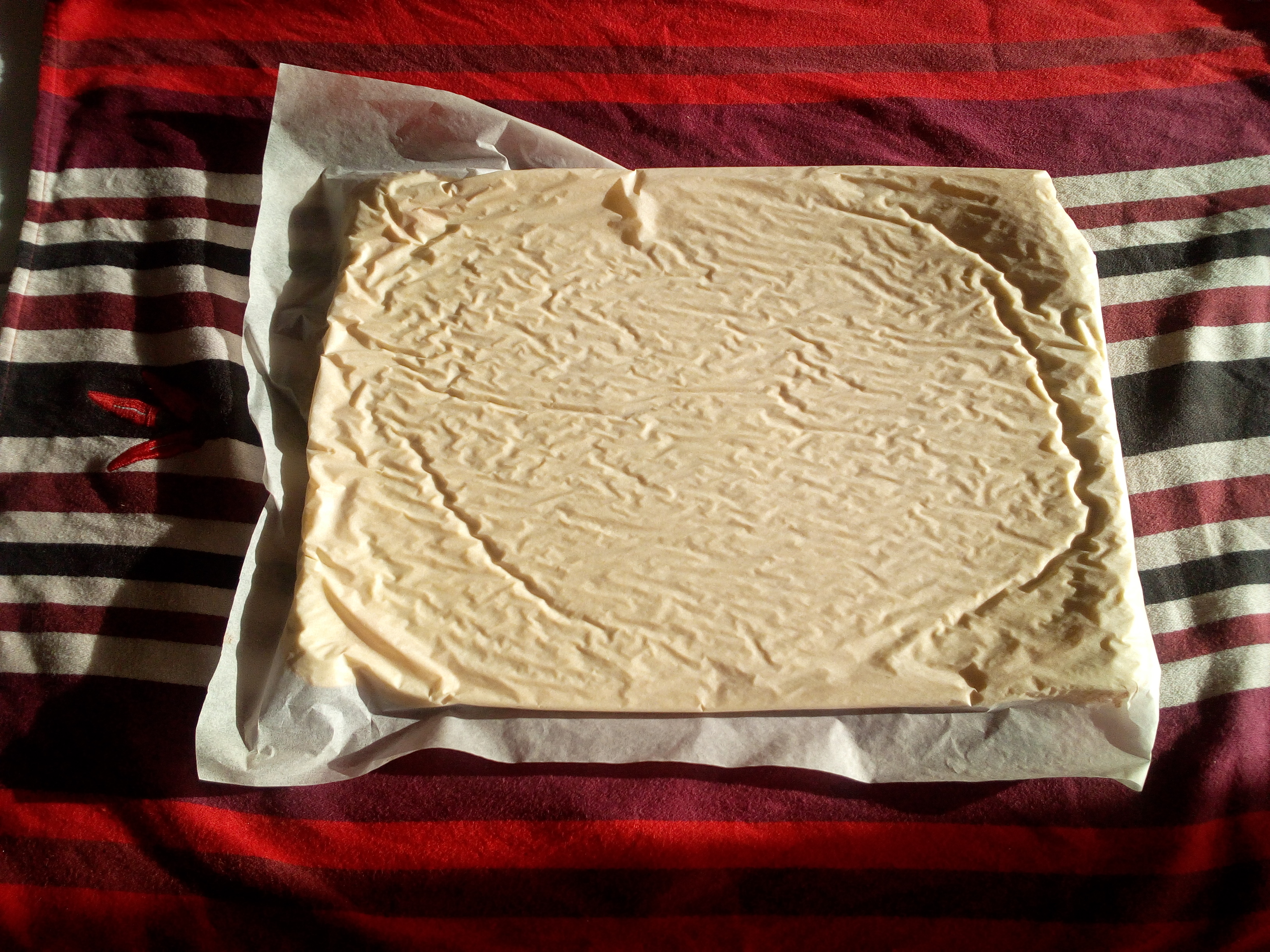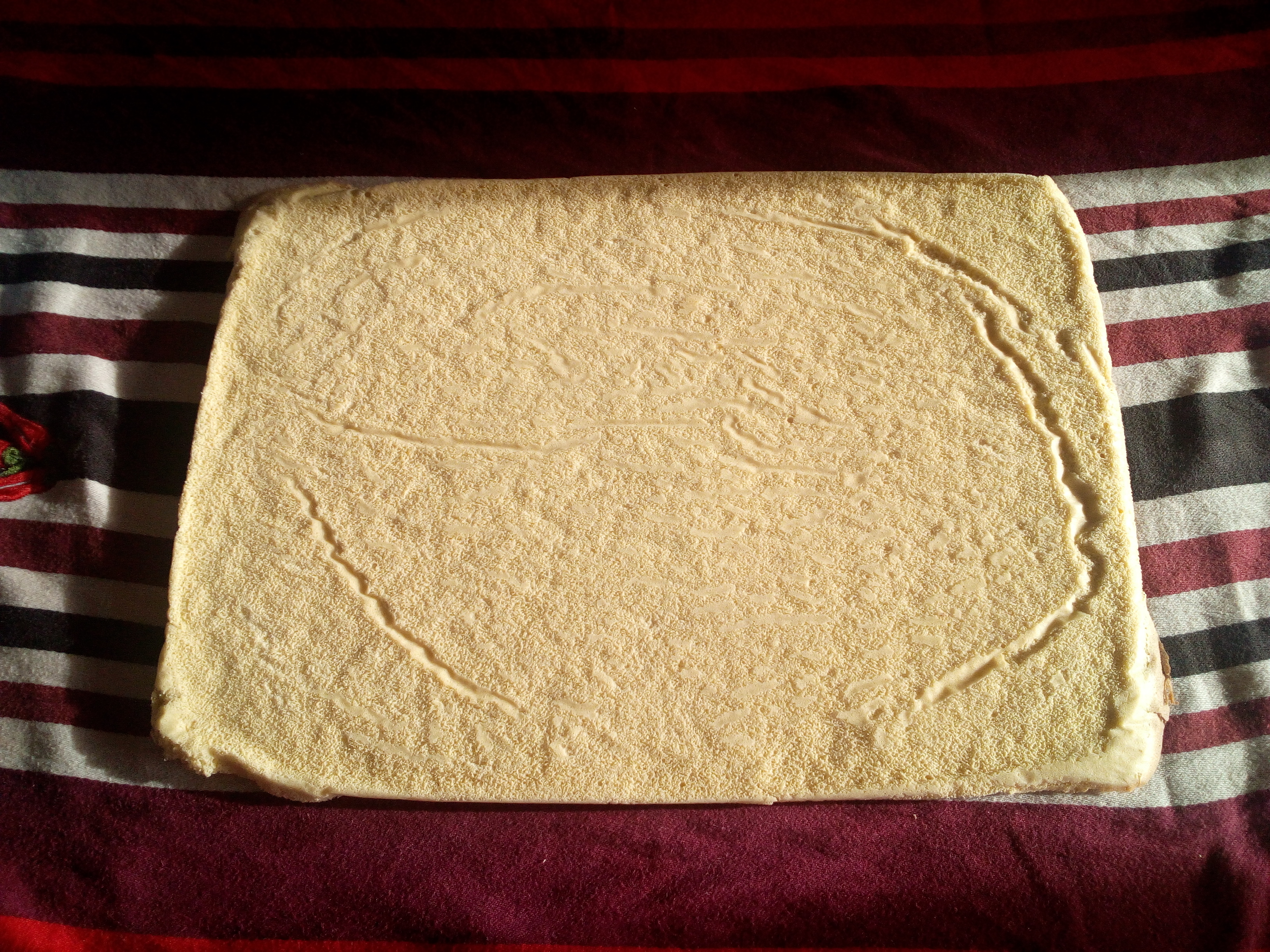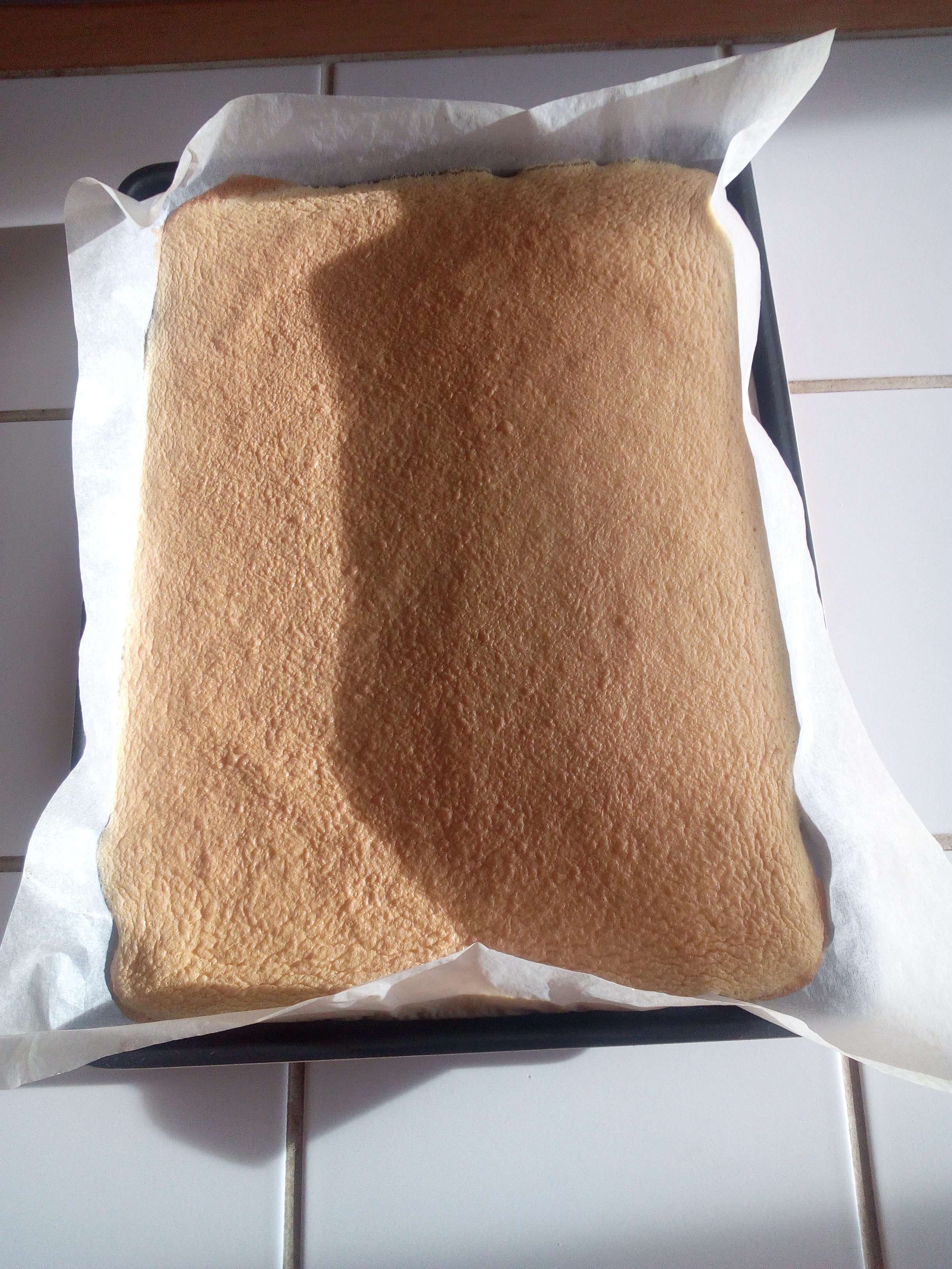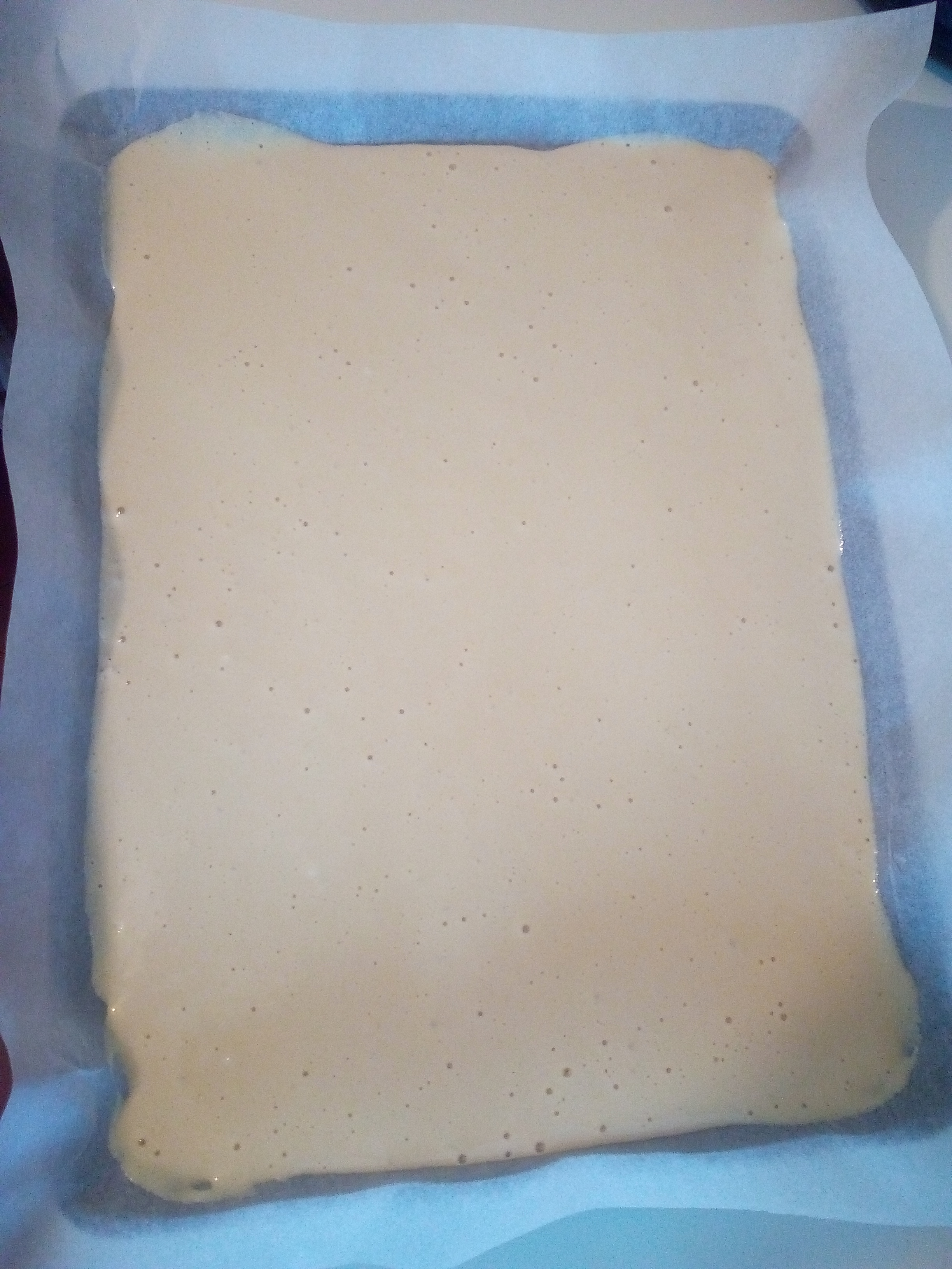 Sur une plaque à pâtisserie avec un rebord, étaler une feuille de papier sulfurisé. Couler délicatement l’appareil sur la feuille, étaler avec une spatule et enfourner à 210 degrés pour 6 minutes.