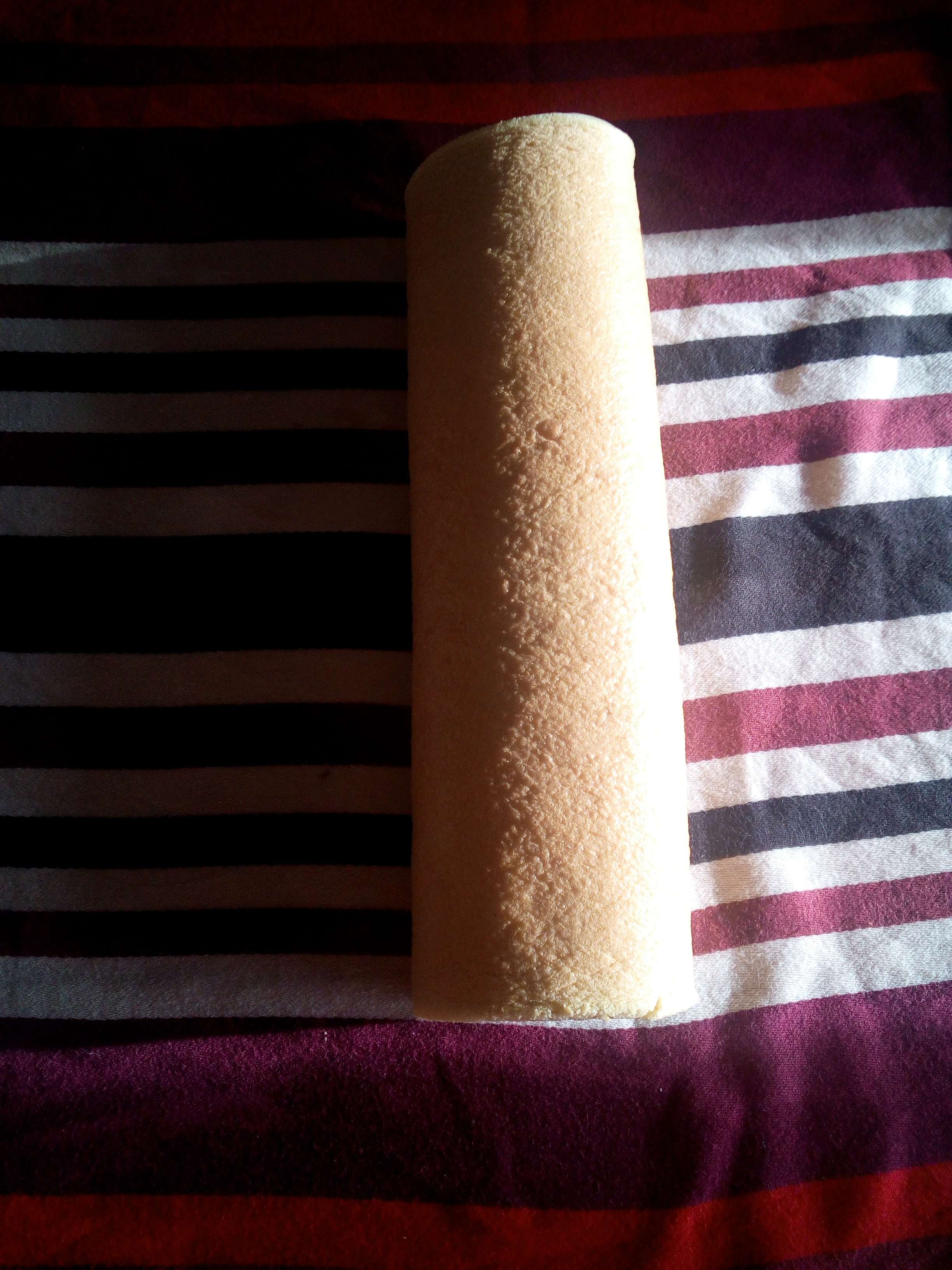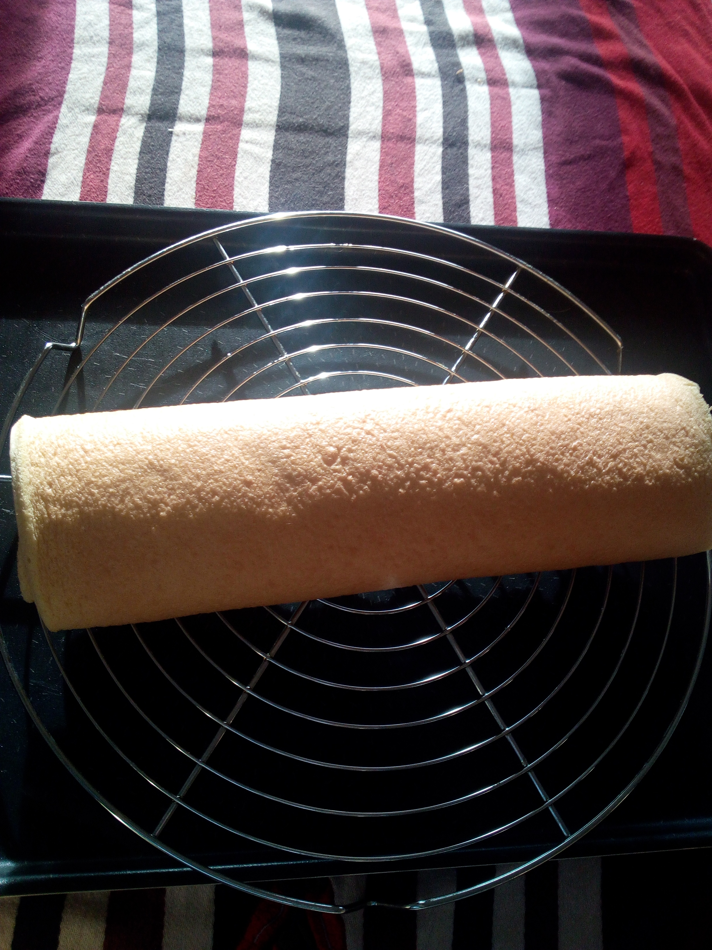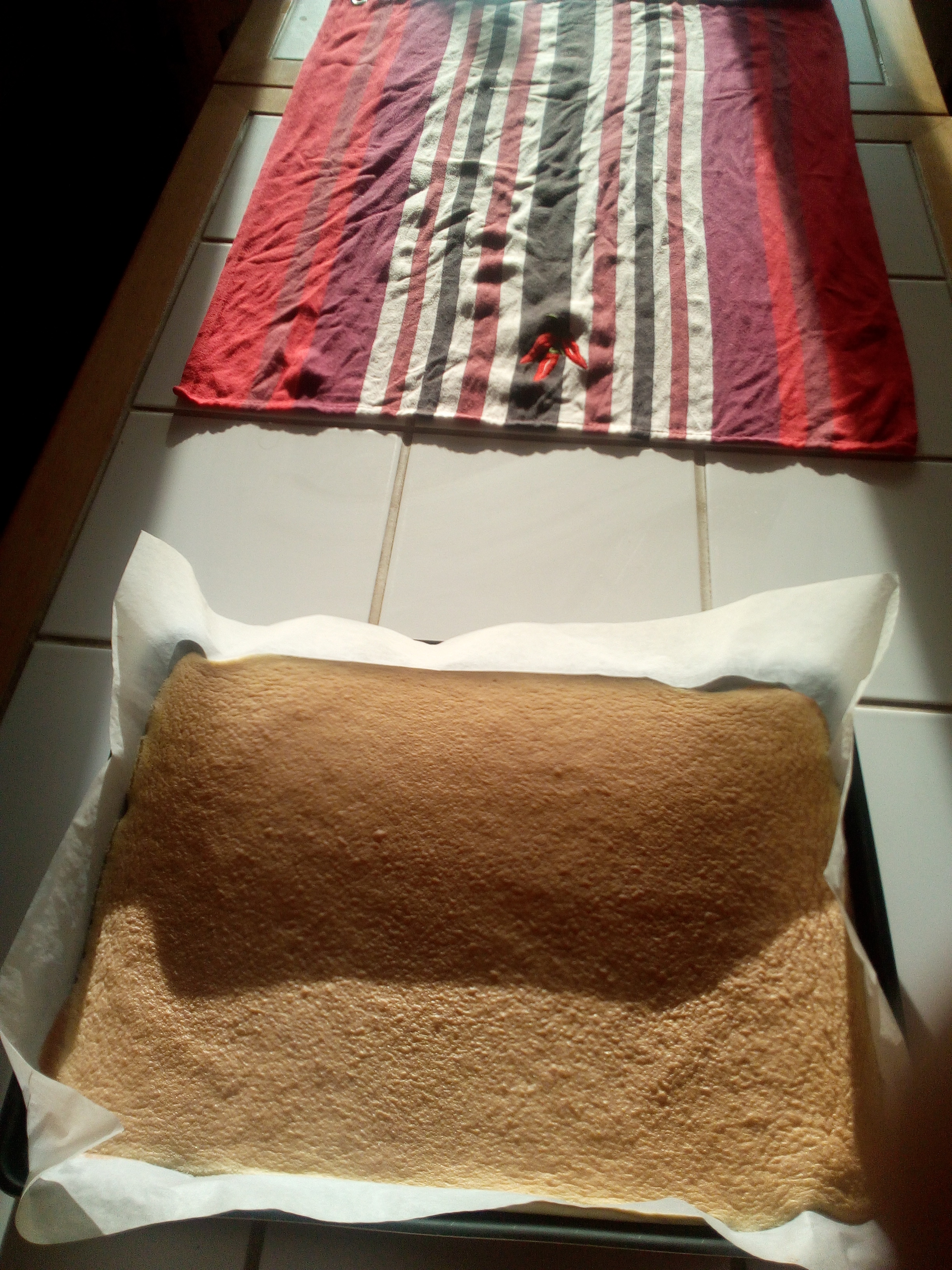 Étaler un torchon humide sur la table et retourner le biscuit dessus. Ôter le papier sulfurisé du biscuit.