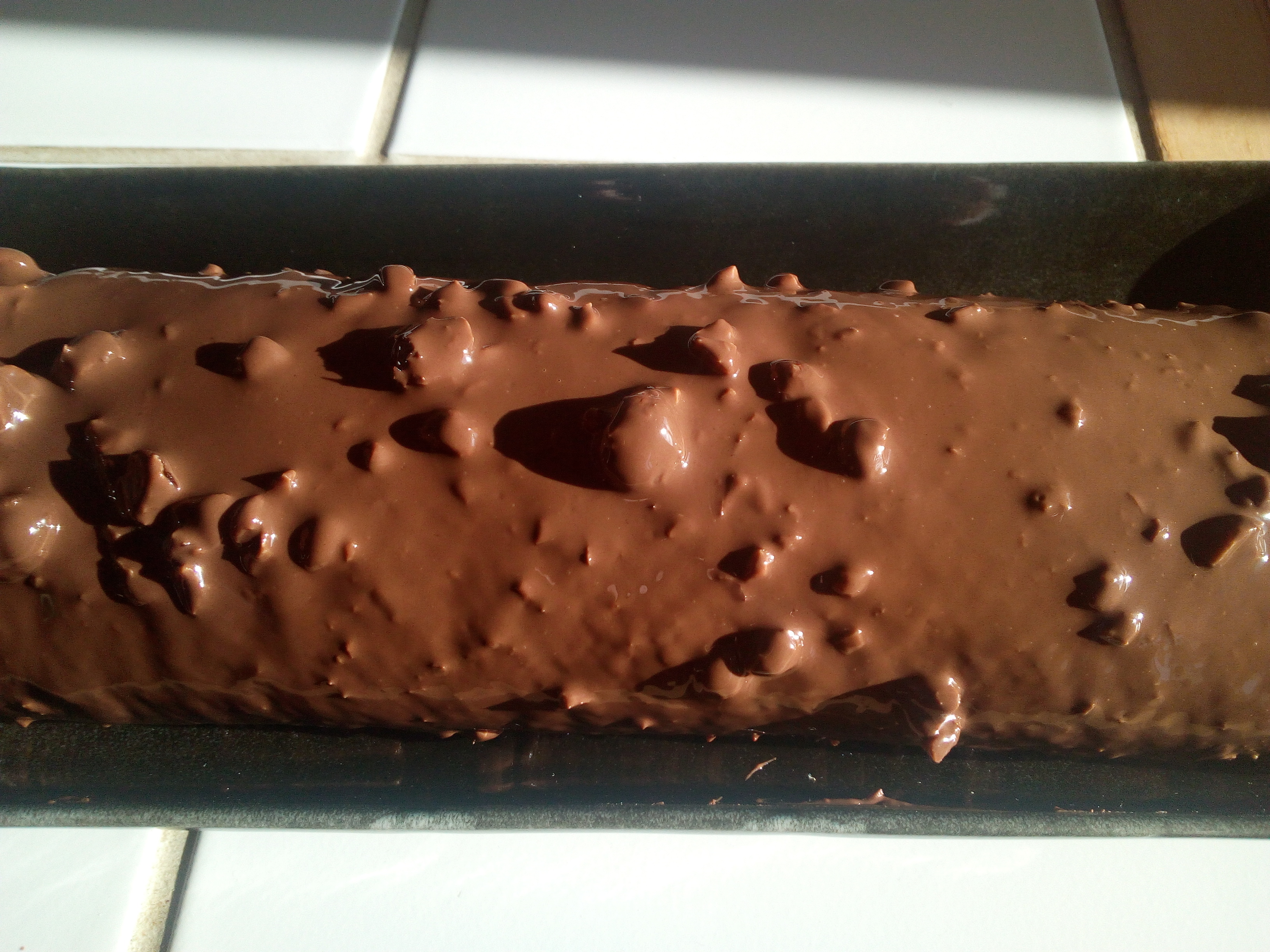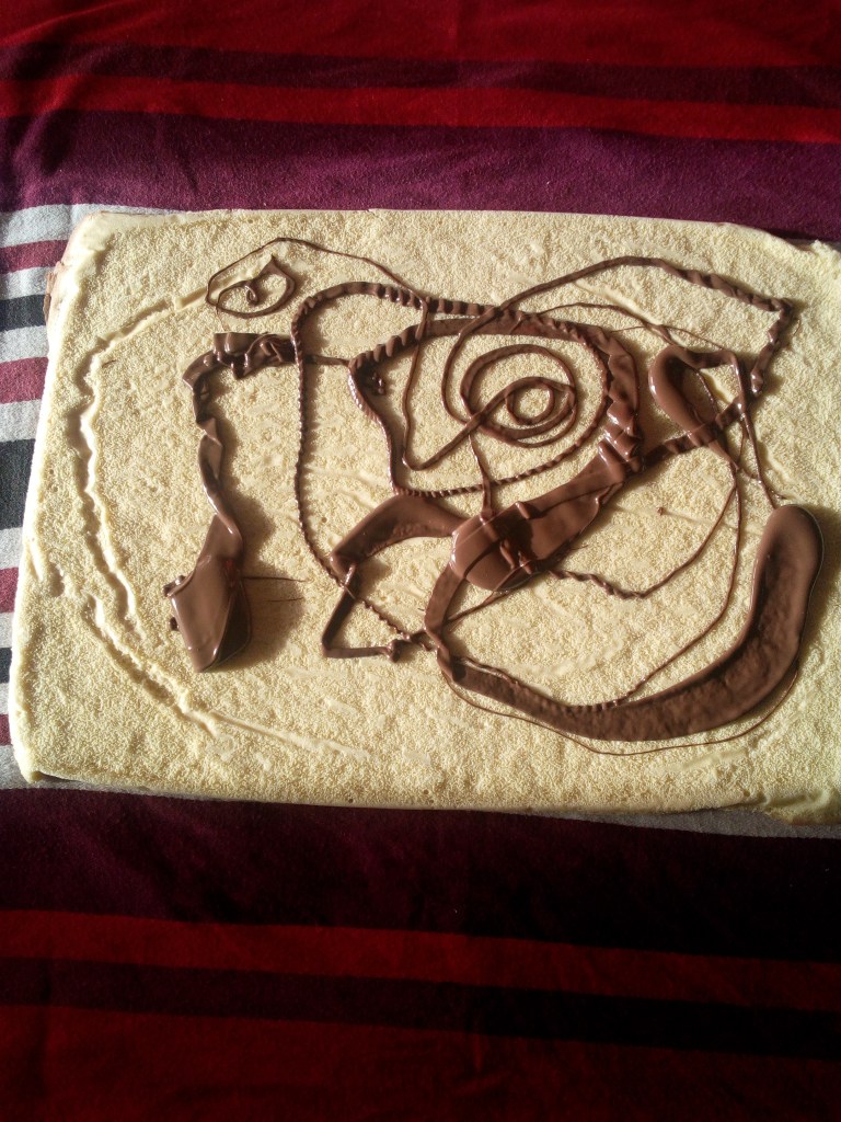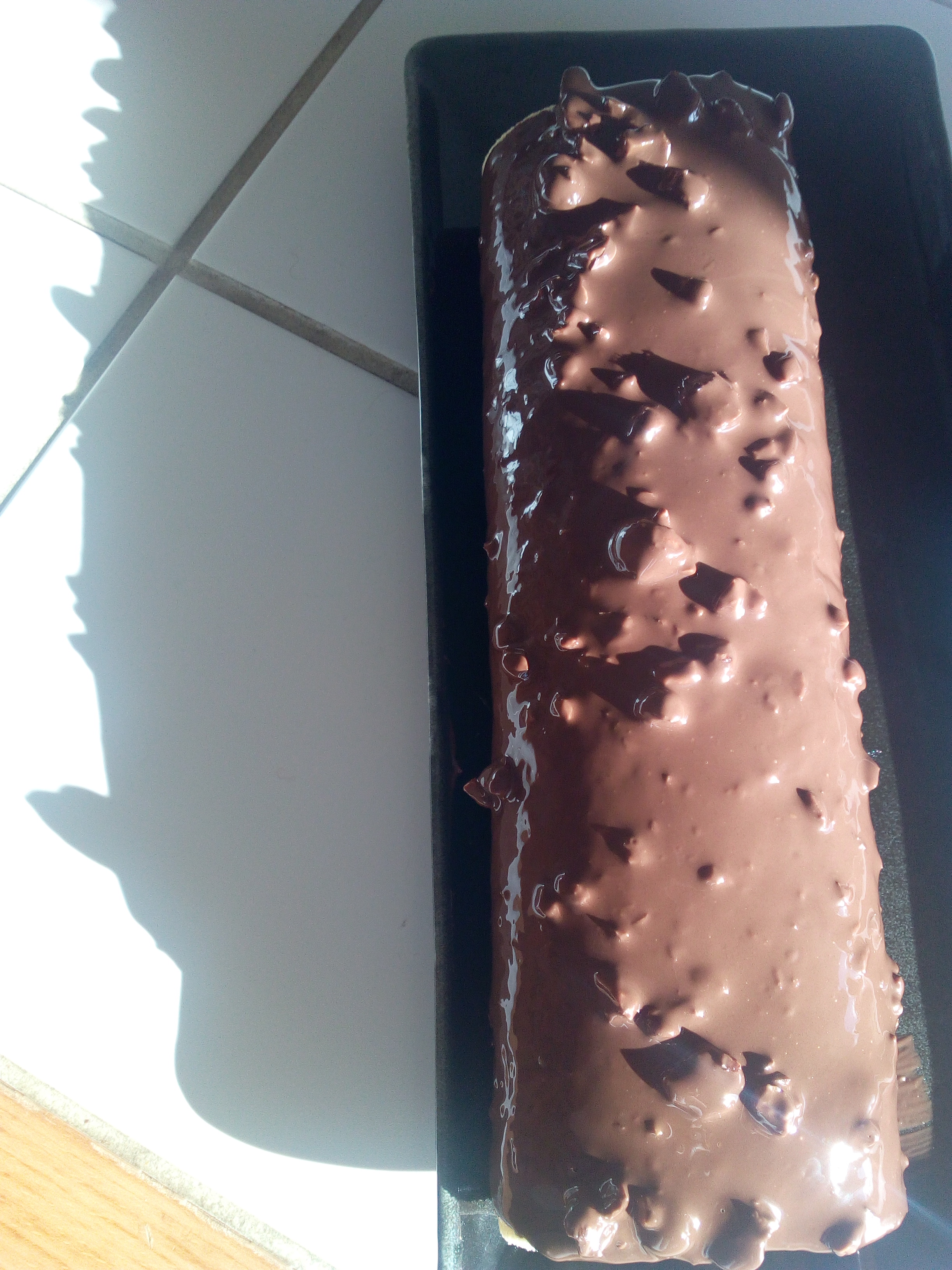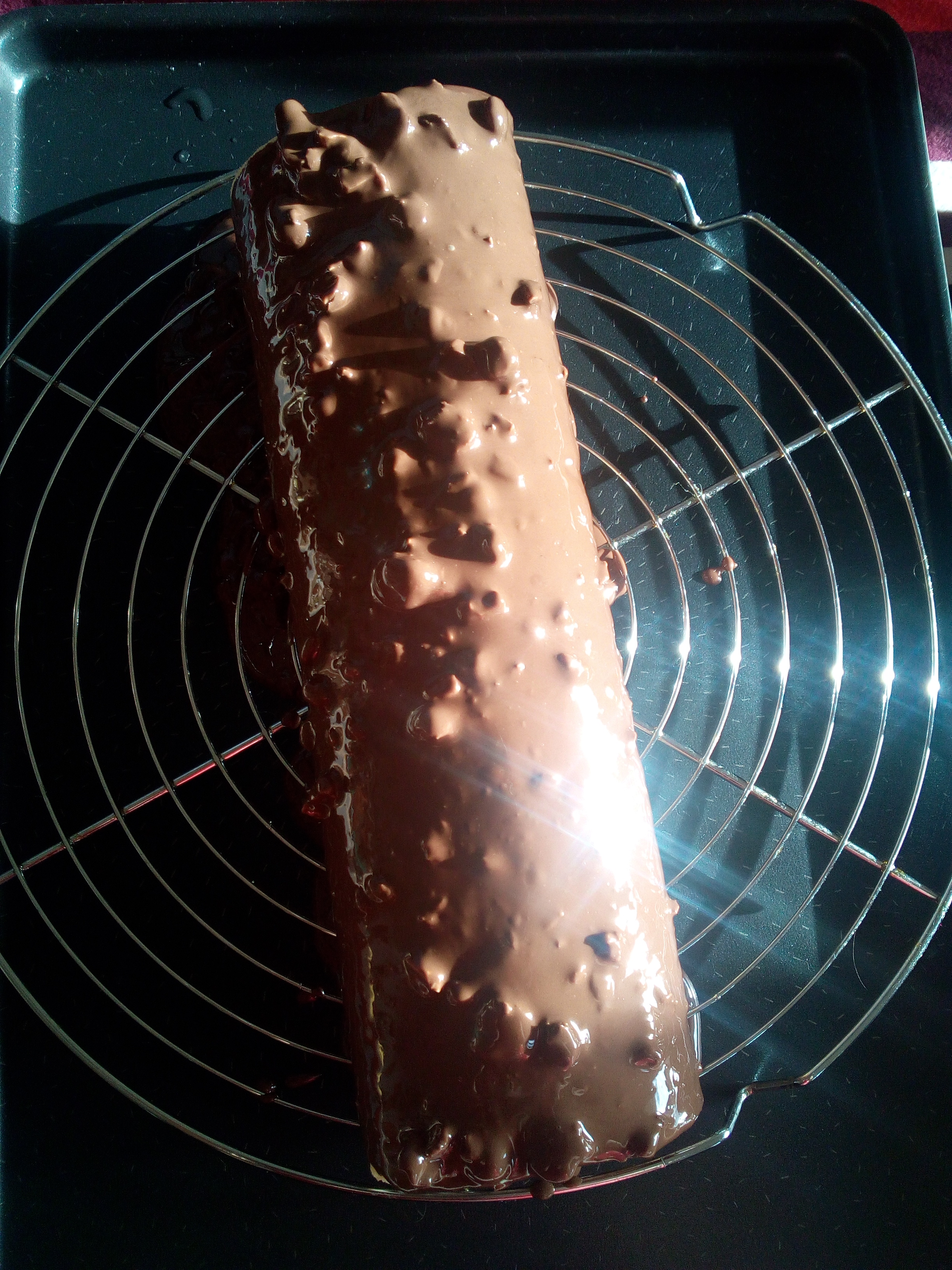 Verser ce glaçage sur le biscuit roulé. Mettre au frais mais pas plus de 30 minutes sinon le glaçage va ternir et perdra son brillant.